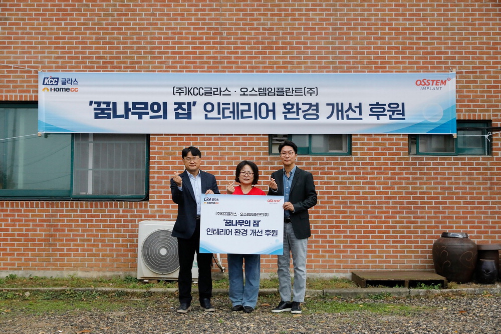 장애인 거주시설 '꿈나무의 집' 환경 개선 인테리어 시공 후원 기념식에서 서진호 KCC글라스 상무,이애순 꿈나무의 집 원장,임정빈 오스템임플란트 본부장(왼쪽부터)이 기념 촬영을 하고 있다. 오스템임플란트