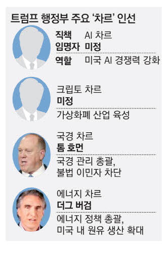 도널드 트럼프 미국 대통령 당선인이 백악관에 인공지능(AI)에 관한 연방 정책과 정부 활용 등을 조정하는 이른바 'AI 차르(czar)' 임명을 검토하면서 누가 선택될지에 관심이 쏠린다. 백악관에서 가상화폐를 담당하는 직책 신설까지 검토하면서 이미 임명된 국경·에너지 차르에 이어 최대 4명의 차르가 임명될 것으로 예상된다.