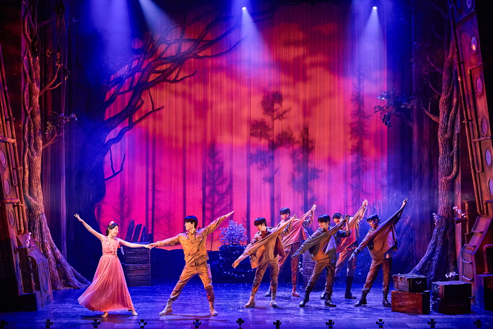 미디어아트의 다양한 색감과 오브제를 활용해 무대를 풍성하게 꾸몄다. 나뭇잎으로 만든 고깔모나 꽃가지 소품은 전쟁 속 희망을 상징한다. 내년 3월 3일까지 서울 대학로 인터파크 유니플렉스 1관.
