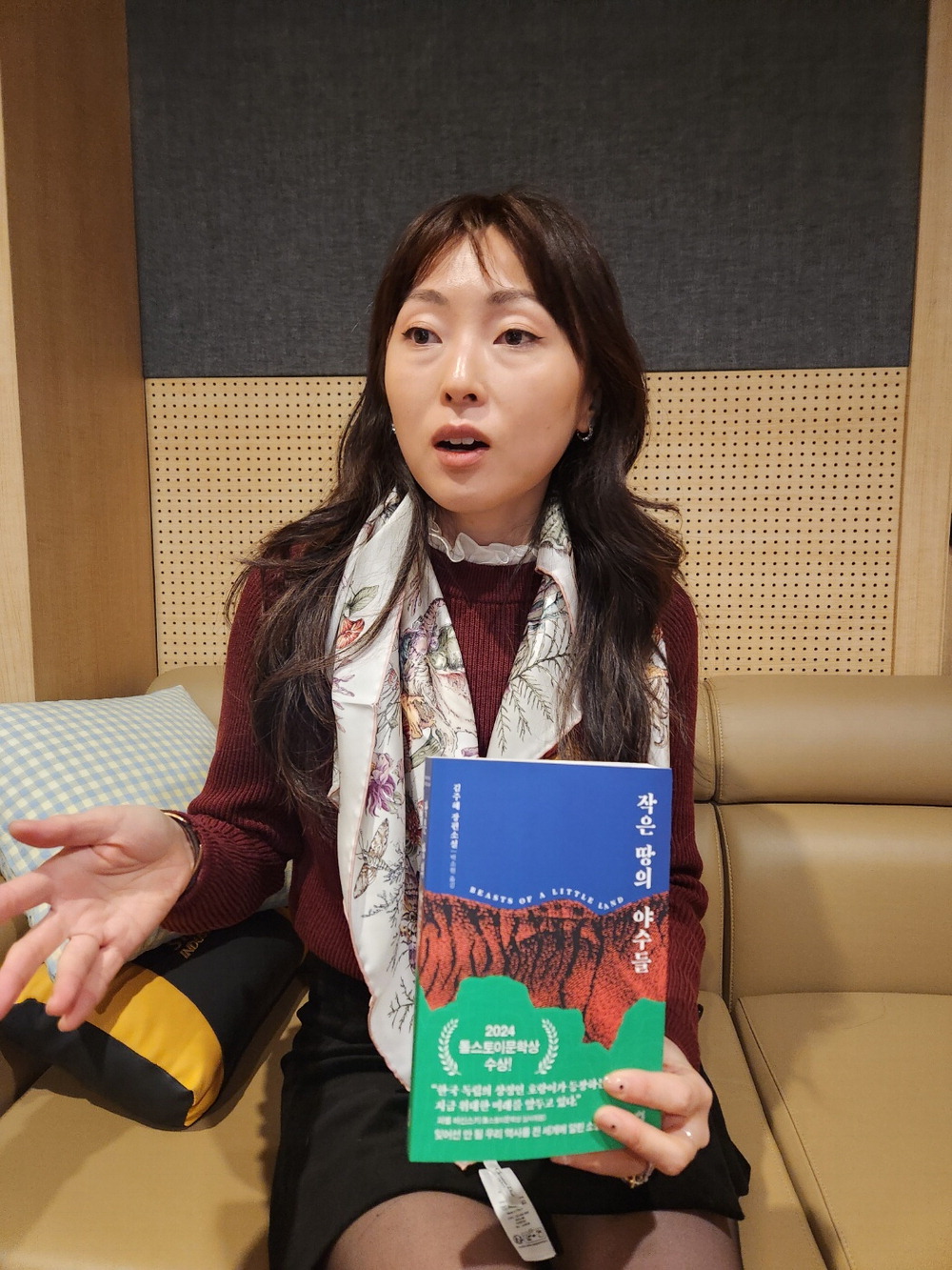 김주혜 작가가 소설 '작은 땅의 야수들'을 든 채로 포즈를 취하고 있다. 박윤예 기자