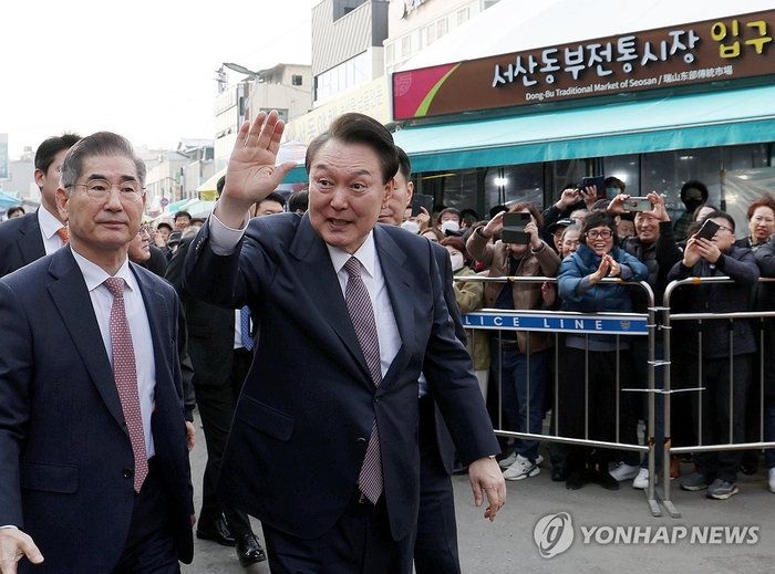 윤석열 대통령이 지난해 2월 26일 충남 서산 동부 전통시장을 찾아 시민과 싱인들에게 인사하고 있다. 옆에는 김용현 전 국방부 장관(왼쪽)이 이날 동행했다. [사진 = 연합뉴스] 비상계엄과 탄핵 정국 영향으로 연말연시 내수가 꽁꽁 얼어붙었다.