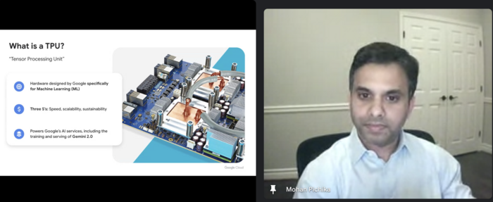 모한 피치카 구글 클라우드 그룹 프로덕트 매니저가 16일 오전 온라인으로 진행된 구글 클라우드 온라인 세션에서 구글의 인공지능(AI) 반도체인 ‘텐서처리장치(TPU)’에 대해 설명하고 있다. [사진 = 온라인 캡처] 인공지능(AI)을 원활히 개발하고 구동하기 위한 AI 반도체의 중요성이 날로 커지는 가운데,구글 클라우드가 자체 개발한 AI 반도체인 ‘텐서처리장치(TPU)’의 6세대 제품인 ‘트릴리움’으로 고객사 확보에 나섰다.