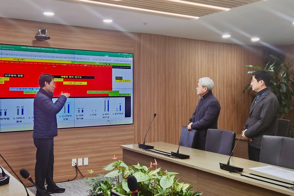 윤희성 한국수출입은행장(가운데)이 26일 오전 서울 여의도 본점에 출근해 데이터센터 이전을 앞두고 서버,스토리지 등 주요 장비를 교체 중인 직원들을 격려했다. 수은은 올해 상반기 본점 데이터센터를 경기 용인시 인재개발원에 새로 만든 데이터센터로 옮길 예정이다. 한국수출입은행