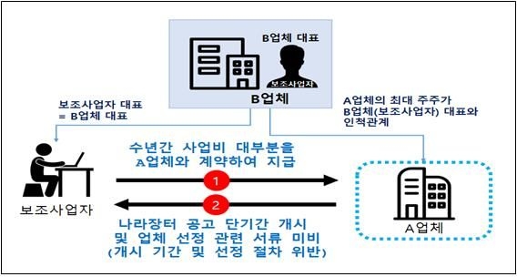 한 사업자는 친척이 최대 주주로 있는 회사와 5년간 수의계약을 체결해 총 39억1000만원을 몰아줬다. 계약 체결 후 2개월 뒤엔 요식행위로 조달청 나라장터에 긴급 입찰 공고를 내 단속을 피하려 한 정황도 있었다. 또 사업자가 소유한 장비에 새 라벨을 붙여 새로 구매한 것처럼 보조금을 타낸 경우도 있었다. 이같은 부정(392억원)과 가족간 거래(38억8000만원)는 전체 적발금액이 87.4%에 달했다.