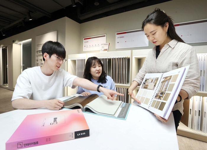 LX하우시스 지인스퀘어 영등포 전시장에서 고객들이 방염 인테리어필름 신제품을 살펴보고 있다. <LX하우시스> LX하우시스가 ‘LX Z:IN(지인) 방염 인테리어 필름’이 환경부의 환경표지인증을 획득했다고 12일 밝혔다.