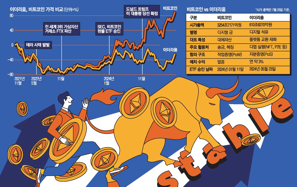 비트코인이 지난해 1월 현물 ETF 출시 이후 3배 가까이 오른 데 비해 이더리움은 2021년 11월 4900달러(당시 약 550만원)로 사상 최고가를 기록한 이후 4년 가까이 부진을 면치 못하고 있다. 지난 연말 환율 급등으로 원화로는 560만원까지 올랐지만 달러 기준으로는 여전히 4000달러를 밑돈다. 지난해 7월 이더리움 현물 ETF도 출시됐지만 비트코인과는 다르게 가격에 큰 영향을 주지 못했다.
