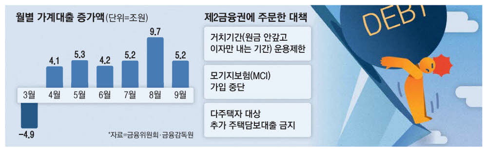 대출자들이 원금은 안 갚고 이자만 내는 기간(거치기간)을 둘 수 없도록 제한하고,모기지보험(MCI) 가입을 중단하면서 다주택자를 대상으로 추가 주담대를 하지 못하도록 하겠다는 것이다. 이는 9월 2단계 스트레스 총부채원리금상환비율(DSR) 대출 규제 시행을 전후해 은행권과 일부 보험사에서 단행했던 조치인데,이를 제2금융권에도 적용할 수 있는지 살펴보겠다는 게 당국 방침이다.