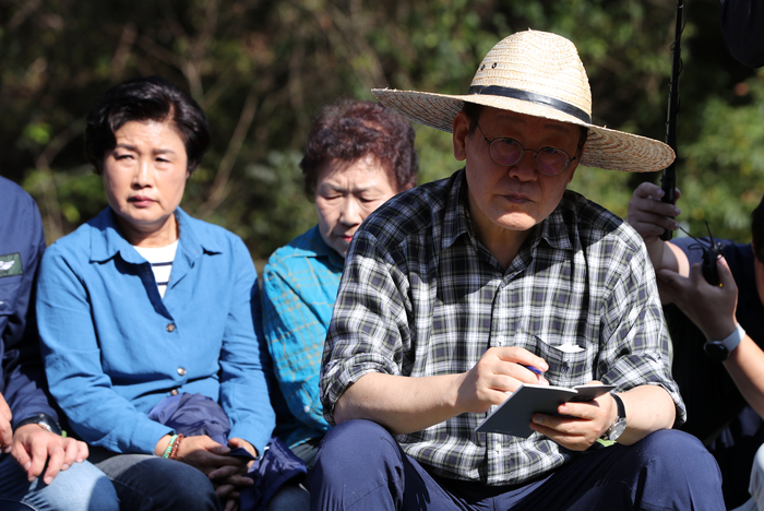 이재명 더불어민주당 대표가 17일 강원 평창군 방림면 게촌리 배추밭을 찾아 농민들의 애로사항을 듣고 메모하고 있다. [사진 출처=연합뉴스] 이재명 더불어민주당 대표가 10·16 재보궐 선거 다음날 곧바로 현장으로 달려갔다. 한 달 남짓 남은 공직선거법 위반 혐의 선고를 앞두고 시간을 쪼개 민생 행보에 박차를 가하는 모습이다.