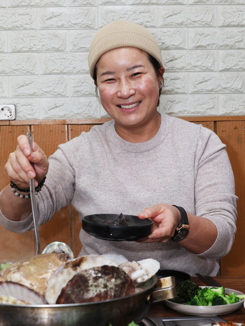 박세리 감독이 뚝도지기 해신탕을 떠주며 밝게 웃고 있다.