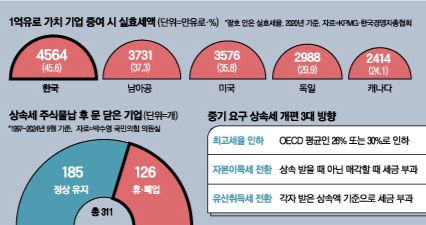 과도한 상속세 부담으로 인한 폐업도 속출하고 있다. 24일 기획재정부에 따르면 1997년부터 작년 9월까지 주식 물납으로 상속세를 낸 기업 311곳 중 휴·폐업한 회사는 126곳으로 40.5%에 달했다. 대부분 상속세를 내고 수년 안에 문을 닫았고,서너 달 만에 파산한 회사도 있었다.
