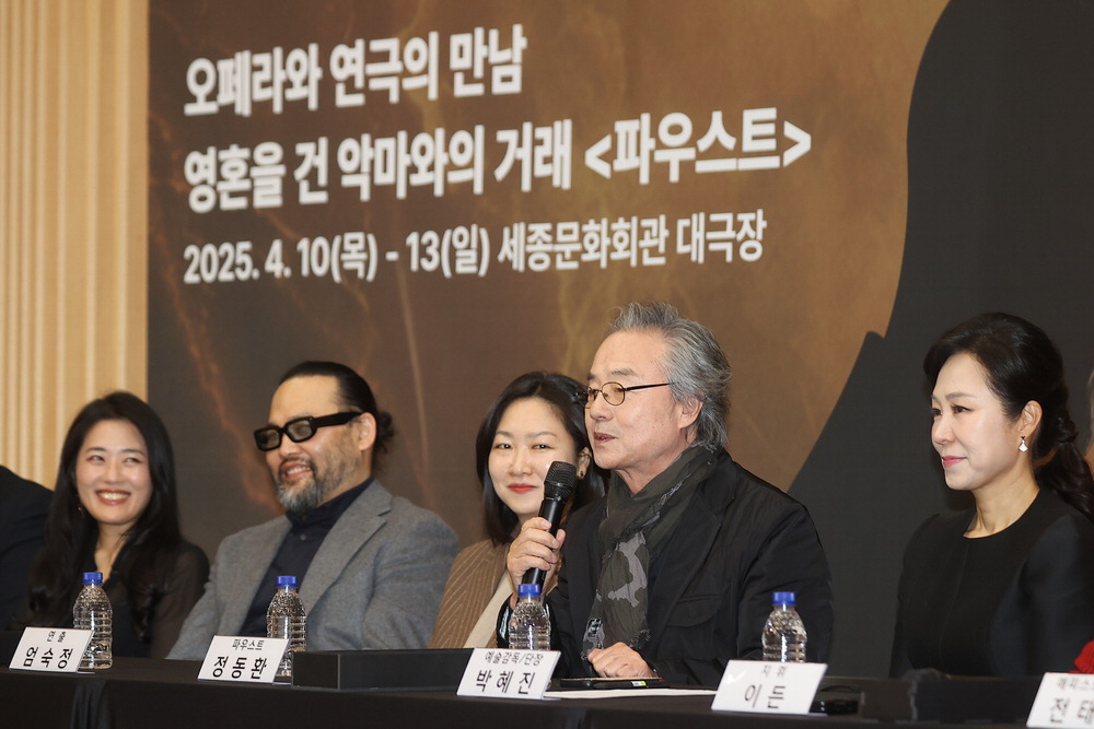 20일 '파우스트' 제작 간담회에 참석한 소프라노 손지혜,베이스바리톤 사무엘 윤,연출가 엄숙정,배우 정동환,예술감독 박혜진 서울시오페라단장(왼쪽부터). 연합뉴스