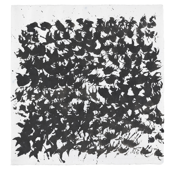 박인경 ‘Envol’ (2025). S2A갤러리 1세대 여성 화가 박인경의 수묵 추상은 유독 묵직한 힘이 느껴진다. 박 작가의 작품명 ‘Envol’은 프랑스어로 이륙,날갯짓과 같은 의미를 가진 단어다. 이 작품에서는 간결한 지필묵을 활용해 기운생동하는 광경을 그렸다. 평소에 그는 지필묵을 활용해 숲,나무 등 자연을 표현하는 전통 수묵화의 흐름을 잇되,재료를 화면에 쏟아붓는 등 다양한 기법을 활용하고 과감히 생략·확대하는 서양식 추상화의 면모를 보여줬다.