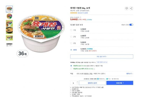 5월 22일 유통업계에 따르면 전날 오후 11시께 쿠팡 판매사이트에 육개장 사발면 36개들이 상품이 5040원에 노출됐다. 개당 140원꼴이다. 원래 2만7000∼2만8000원대에 팔리던 상품이라는 점을 고려하면 5분의 1을 밑도는 가격이다.
