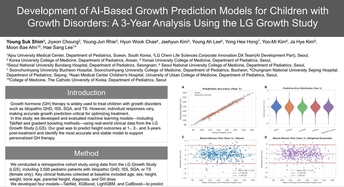 발표자로 나선 심영석 교수는 “저신장증 환아들의 성장호르몬제 치료 효과를 예상하기 위한 진료 현장의 수요가 지속 커지고 있다”며 “LG화학의 유트로핀 장기안전성 연구(LG Growth Study)를 통해 누적된 대규모의 치료 데이터를 활용해 키 성장 예측 AI 모델을 고도화했다”고 말했다.