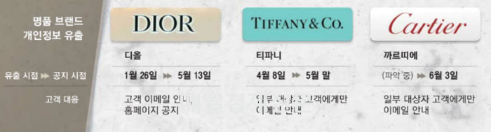 앞서 루이뷔통모에헤네시(LVMH) 그룹 산하 브랜드인 디올과 티파니에서 고객정보 유출 사실을 뒤늦게 알리며 논란이 됐다. 디올은 지난 1월 26일 고객 다수의 이름과 휴대전화,주소,경칭(사회적 신분),구매 상품 등이 포함된 개인정보가 유출된 사실을 지난달 13일 홈페이지에 공지했다.