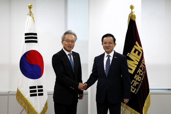 최진식 중견기업연합회장(왼쪽)이 지난 16일 서울 마포구 중견련을 방문한 다이빙 주한 중국대사를 접견하며 기념촬영을 하고 있다. [사진 제공=중견기업연합회] 최진식 한국중견기업연합회장이 지난 16일 중견련을 방문한 다이빙 주한 중국대사를 접견하고,글로벌 경제환경 변화에 효과적으로 대응하기 위해서는 실용 중심의 한·중 경제협력을 시급히 회복·강화해야 한다고 강조했다.
