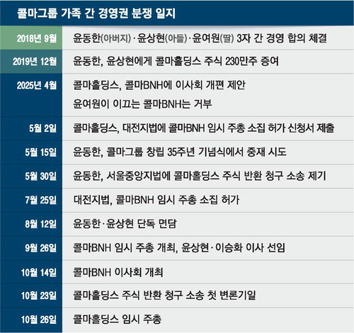 다만 가족 간 갈등의 불씨가 완전히 사그라든 것은 아니다. 갈등의 한 축이었던 콜마비앤에이치 실적 부진과 관련한 경영진 재정비는 이뤄졌지만,또 다른 축인 증여 주식 반환 청구 소송은 시작 단계다. 첫 심문기일은 오는 23일로 예정돼 있다. 당분간 윤동한 회장과 아들 윤 부회장 간 지분을 둘러싼 물밑 힘겨루기가 간헐적으로 이어질 수 있다.