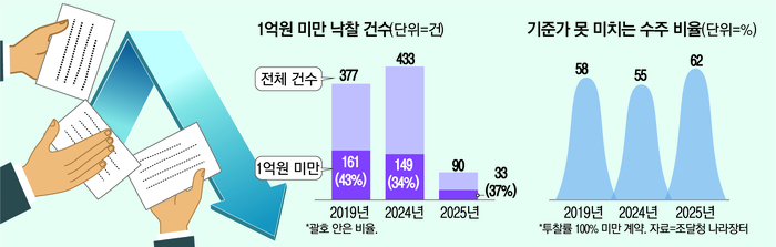 나라장터에 따르면 투찰률 100%가 안 되는 낙찰이 지난해 239건으로 55.2%에 달했다. 올해도 6월까지 56건(62.2%)이 투찰률 100%에 못 미쳤다. 투찰률이 100%가 안 된다는 것은 공공기관이 제시한 가격보다도 낮은 가격에 낙찰이 됐다는 의미로 ‘덤핑 수주’를 했다는 얘기다.