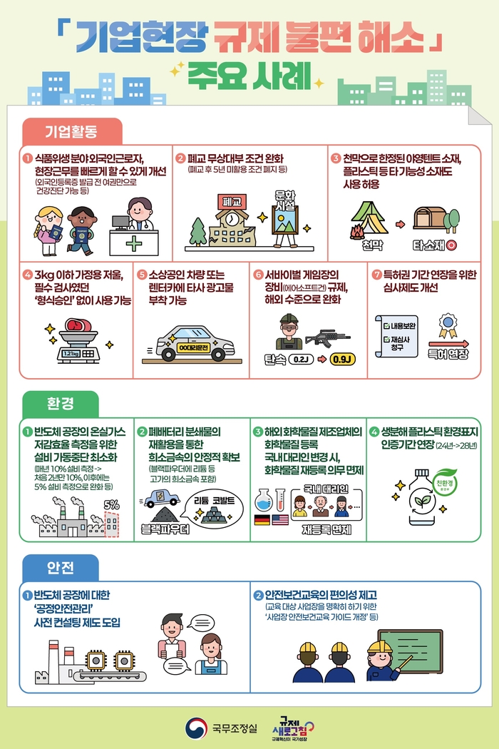 이밖에 △천막으로 한정된 야영텐트 소재 확대 △3Kg 이하 가정용 저울 형식승인 철폐 △소상공인차량·렌터카의 타사 광고물 부착 △서바이벌 게이미장 장비 규제 완화 △특허권 기간 연장 심사제도 개선 △화학물질 등록 대리인 변경시 화학물질 재등록 의무 면제 △생분해 플라스틱 환경표지 인증제도 개선 △안전보건교육 편의성 제고 등도 개선내용에 포함됐다.