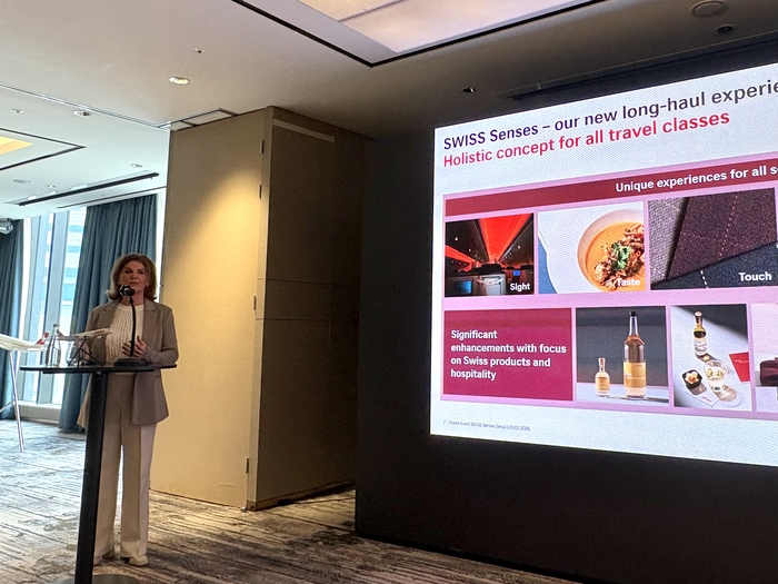 발표하는 하이케 빌렌바흐(Heike Birlenbach) 스위스 항공 최고상업책임자(CCO)/사진=김지은 여행+ 기자 스위스 항공은 지난 30일 서울 용산구에서 미디어 라운드테이블을 열고 스위스 취리히~인천 노선에 A350 항공기를 투입했다고 밝혔다.