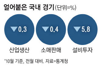 지난달 생산·소비·투자 지표가 모두 뒷걸음질을 치며 경기 둔화의 그림자가 짙어지고 있다. 더디게 회복되는 소비와 악재가 겹친 건설업 위기가 장기화되면서 내수 부진이 계속되고 있기 때문이다. 한국 경제를 떠받치고 있는 수출 역시 내년부터는 대외 불확실성으로 부진할 수 있다는 예측이 나온다. 한국은행이 전격적으로 금리를 인하했지만 경기 침체를 막기 위해선 추가적인 통화·재정정책 조합이 필요하다는 지적이다.