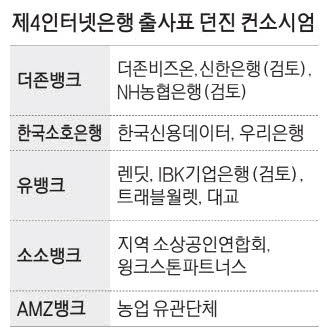 다른 컨소시엄도 상황이 비슷하다. 우리은행과 우리카드는 한국신용데이터가 주도하는 한국소호은행에 투자의향서를 전달했다. 전국 130만 사업장에 도입된 경영 관리 데이터를 통해 소상공인 특화 은행을 만들겠다는 목표다. 유뱅크는 중소기업,고령층과 외국인에 대한 특화 은행을 천명했는데 IBK기업은행이 참여를 검토 중이다.
