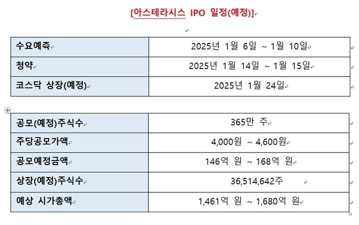 한편 아스테라시스는 금감원에 정정 증권신고서를 제출함에 따라 코스닥 상장을 위한 기업공개(IPO) 일정은 내년 1월로 순연됐다.