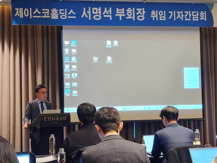 18일 서울 여의도 콘래드호텔에서 열린 서명석 제이스코홀딩스 부회장 취임 기자간담회에서 서 부회장이 인삿말을 하고 있다. [사진=이호준 기자] 18일 서울 여의도에서 열린 취임 기자간담회에서 서명석 제이스코홀딩스 신임 부회장은 “중소기업이 이뤄낸 성과에 대해 업계의 이해도가 낮은 게 안타깝다”며 “국내 최초 해외 자원개발 성공 사례로 기록될 제이스코홀딩스 니켈 사업에 대한 국내외 이해도를 높이고 글로벌 기업으로의 성장을 돕는 게 가장 큰 미션”이라고 밝혔다.