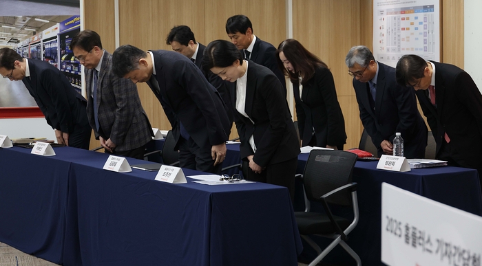 조주연 홈플러스 사장(맨 앞줄 오른쪽)과 김광일 홈플러스 공동대표를 비롯한 홈플러스 경영진들이 14일 서울 강서구 홈플러스 본사에서 열린 기자간담회에서 기업회생으로 불편을 겪고 있는 관계자들을 향해 고개를 숙이고 있다. [한주형 기자] 홈플러스 경영진이 기업회생절차(법정관리)에 돌입한 지 열흘 만에 고개를 숙였다.