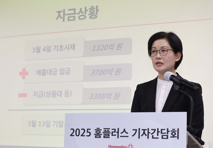 조주연 홈플러스 사장이 14일 서울 강서구 홈플러스 본사에서 열린 기자간담회에서 발언을 하고 있다. [한주형 기자] 조 사장은 “대기업과 브랜드 점주를 제외한 대부분의 영세업자 채권은 곧 지급 완료할 것”이라며 “전날 기준 현금시재가 약 1600억원이며,영업을 통해 매일 현금이 유입되는 점을 고려할 때 잔여 상거래채권 지급도 문제가 없다”고 설명했다. 대기업 채권은 영세상인 몫을 먼저 변제한 뒤 오는 5월까지 상환을 마치겠다는 입장이다.