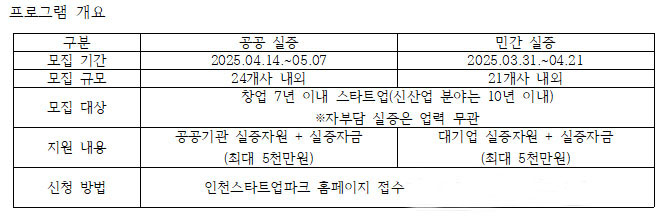 < 프로그램 개요 / 2025 인천스타트업파크 제공 > 올해 공공 실증 협력 파트너(10개 기관)에는 한국환경산업기술원이 신규로 추가돼 △인천경제자유구역청 △인천관광공사 △인천교통공사 △인천국제공항공사 △인천도시공사 △인천시설공단 △인천유나이티드 △인천환경공단 등 총 10개의 공공 협력파트너와 함께 스타트업의 기술 검증 및 사업화를 지원할 예정이다.