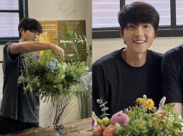 해당 게시물에는 송중기가 꽃꽂이에 열중하고 있는 모습도 함께 담겼다. 그는 플로리스트 A씨와 다정하게 인증샷을 남기기도 했다.