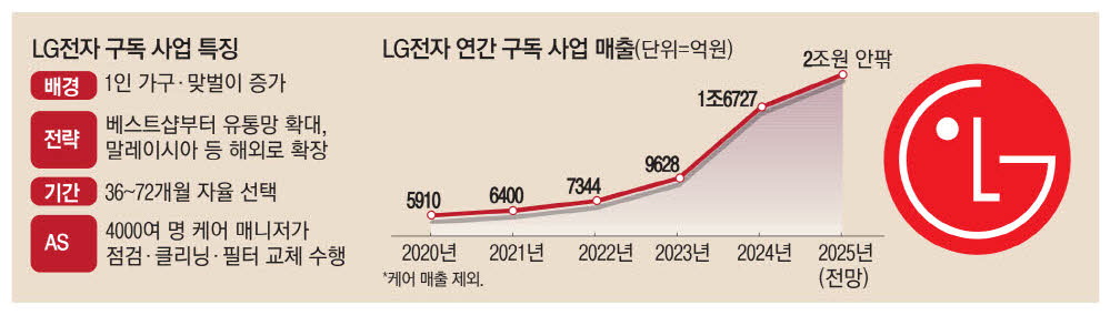 연간 기준으로도 LG전자 구독 사업은 가파른 성장세를 기록하고 있다. 지난해 LG전자 연간 구독 매출(케어 매출 제외)은 1조6727억원으로 2023년(9628억원) 대비 73.7%나 증가했다.