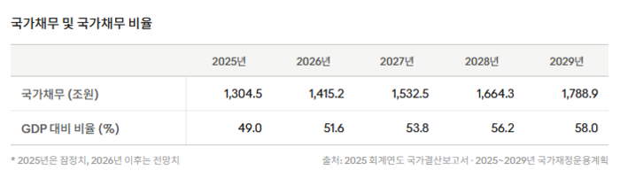 정부는 지난해 9월 국회에 제출한 ‘2025∼2029년 국가재정운용계획’ 등에서 국가채무가 2026년 1415조 2000억원,2027년 1532조 5000억원,2028년 1664조 3000억원,2029년 1788조 9000억원으로 늘어날 것으로 내다봤다. 해당 전망대로라면 올해부터 2029년까지 연평균 약 121조원씩 증가하는 셈이다. 이에 국가채무비율은 2026년 51.6%,2027년 53.8%,2028년 56.2%,2029년 58.0%로 확대할 것으로 관측된다.