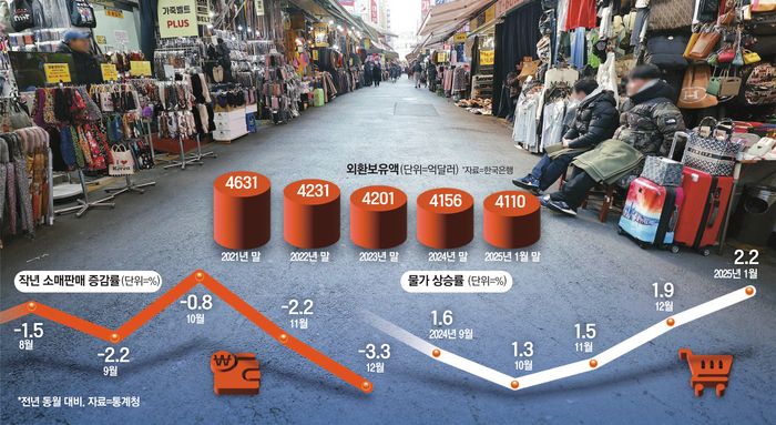 수입품 물가는 달러당 원화값이 좌우하는데,1월 말 외환보유액이 4110억달러로 2020년 6월 4107억달러 이후 4년7개월 만에 최저치를 기록했다. 작년 말 4156억달러와 비교해 45억9000만달러가 줄었는데,달러당 1400원대 후반까지 밀린 원화값을 방어하는 데 투입된 것으로 추정된다. 외환보유액은 떨어지는 원화값을 방어하는 실탄이다. 특히 외환보유액 4000억달러가 심리적 저항선인데,환율 불안이 지속돼 4000억달러 선이 무너질 경우 시장 충격이 예상된다.