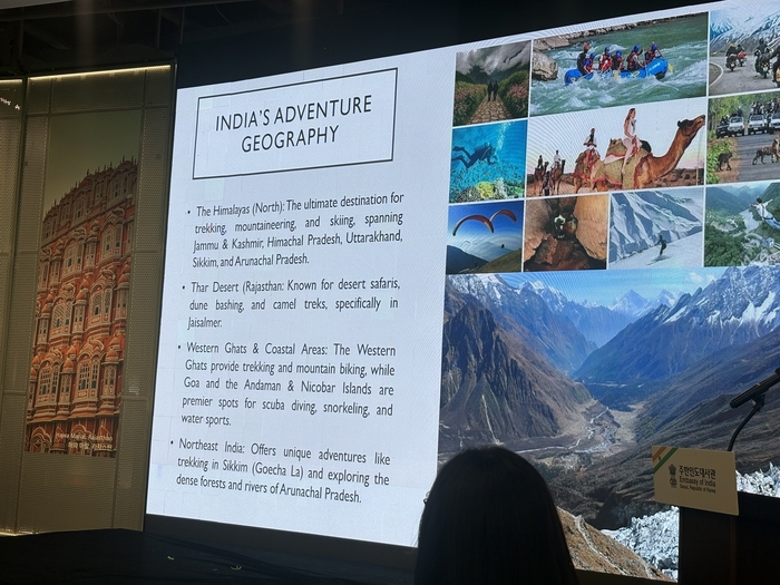 인도 액티비티 관광/사진=김지은 여행+ 기자 액티비티 관광도 빠르게 성장하고 있다. 인도는 히말라야부터 사막,열대우림,해변까지 다양한 지형을 갖춘 만큼 지역별로 색다른 체험이 가능하다. 수라브 K(Sourabh K.) 3등서기관은 “인도는 모든 지형에서 어드벤처를 즐길 수 있는 나라”라며 트레킹과 하이킹,수상 스포츠 등 폭넓은 액티비티를 소개했다.