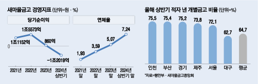 올해 상반기 지역별로 살펴보면 인천의 지역의 개별금고 중 75.5%에서 적자가 발생해 가장 높은 비율을 기록했다. 이어 부산(75.4%),경기 (75.2%),제주 (73.8%),서울(72.1%) 등 순이었다.