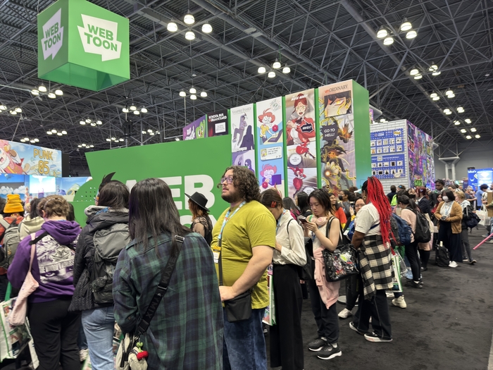 17일(현지시간) 미국 뉴욕에서 개막한 ‘뉴욕 코믹콘(NYCC) 2024’ 네이버웹툰 부스에서 열린 작가 사인회에 팬들이 줄지어 대기하고 있다. [사진 = 연합뉴스] 네이버와 카카오가 미국 뉴욕에서 이달 17일부터 20일(현지시간)까지 열린 북미 최대의 만화 전시회 ‘뉴욕 코믹콘(NYCC) 2024’에 참여하며 북미 독자층 확장에 나섰다. 뉴욕 코믹콘은 매년 20만명 이상의 관람객이 찾는 북미 최대의 만화 축제다.