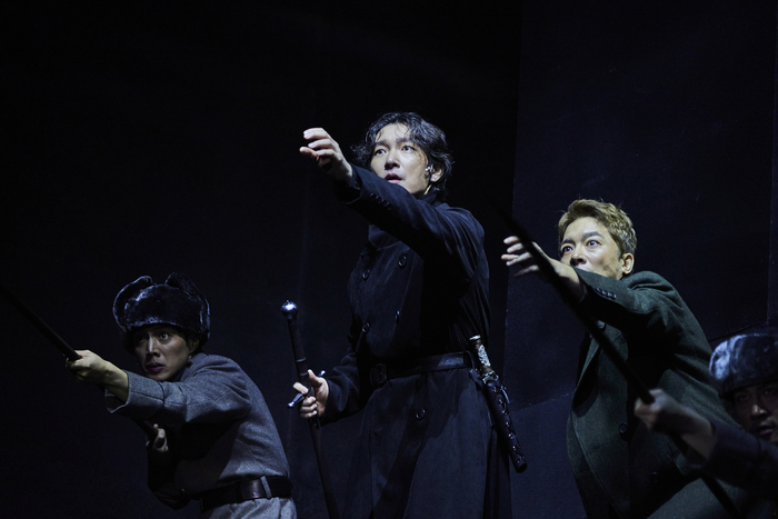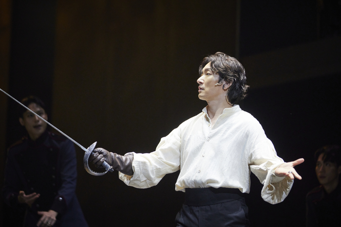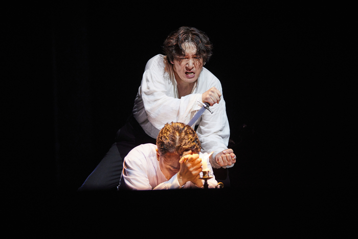 얼굴에 먹구름이 가득하다는 숙부 클로디어스(박성근)의 말에 햄릿의 첫 대사가 공연장에 퍼지고,무대 오른편 층계 뒤에서 5대5 가르마로 이마를 훤히 드러낸 햄릿이 등장한다. 몸을 감싼 코트와 바지,신발까지 모두 검은 색. 창백한 그의 얼굴,새하얀 코트를 빼입은 클로디어스와 선명하게 대조된다.