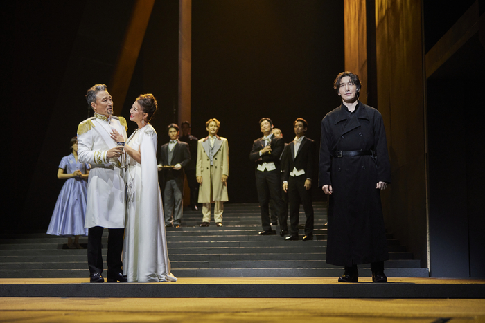 연극‘ 햄릿’의 한 장면. ⓒ예술의전당 세심하게 설계된 무대미술은 위태로운 햄릿의 내면을 시각적으로 강조한다. 앞뒤 폭이 23m에 달하고 계단으로 소실점을 구현한 무대의 깊이감은 그의 고독과 무력감을 표현하는 것처럼 느껴진다. 무대 왼편의 거대한 기둥들은 인간을 압도하는 잔인한 운명을 형상화한 것으로 다가온다.