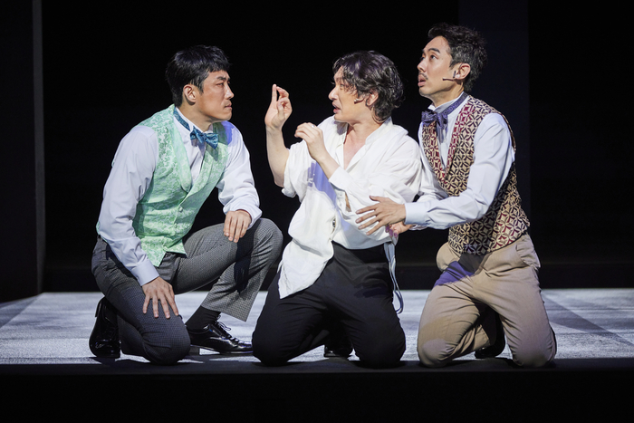 연극‘ 햄릿’의 한 장면. ⓒ예술의전당 어두운 복수극인 ‘햄릿’에서 관객을 웃음 짓게 하는 건 조승우의 가짜 광기다. ‘햄릿’은 클로디어스의 끄나풀인 로젠크란츠(이강욱)와 길덴스턴(전재홍),폴로니어스 등에게 미친 사람 행세를 하는 햄릿의 모습을 우스꽝스럽게 연출한다. 영화 ‘타짜’,‘내부자들’ 등에서 대중에게 위트 있는 장면을 선보여 온 조승우는 능청스러운 연기로 관객의 긴장감을 풀어준다.