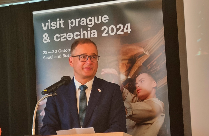얀 플룩사 체코 지역개발부 차관 / 사진=김혜성 여행+ 기자 얀 플룩사(Jan Fluxa) 체코 지역개발부 차관은 “지난해 체코를 찾은 한국인 관광객은 24만 명으로 2019년 대비 65%를 회복한 수준이었으며 올해 상반기에만 약 11만 2000명의 한국인 관광객이 체코를 찾아서 관광 성장세가 뚜렷하다”며 “대한항공의 인천~프라하 노선 직항 등 영향으로 많은 여행객이 서로의 나라를 오가며 유산을 나누고 있다”고 본격적인 시작에 앞서 운을 뗐다.