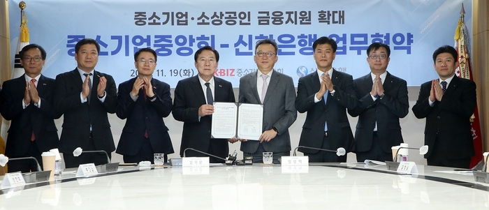 19일 신한은행과 중기중앙회는 여의도 소재 중기중앙회 본사에서 ‘소상공인·중소기업 지원 확대를 위한 업무협약’을 체결했다. 이번 업무협약을 통해 ▲노란우산공제 가입고객 대상 예금 및 대출 금리지원 ▲저출생 극복을 위한 여성 소상공인 출산 지원금 지급 ▲청년 구직자 일자리 매칭 및 취업역량 강화를 위한 업무협력 등을 함께 진행한다.