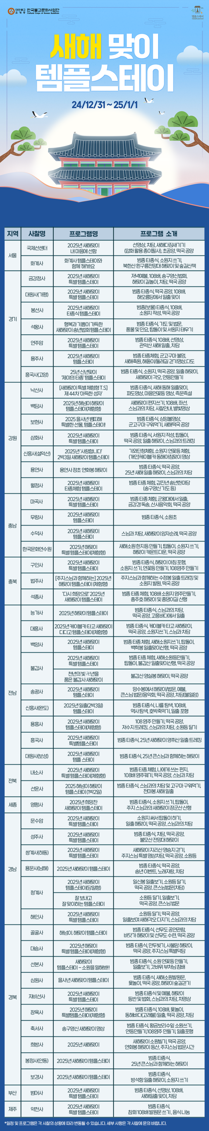 새해맞이 템플스테이는 올해 마지막 날인 12월 31일부터 새해 첫날인 1월 1일까지 1박 2일간 전국 사찰 50여 곳에서 운영된다.