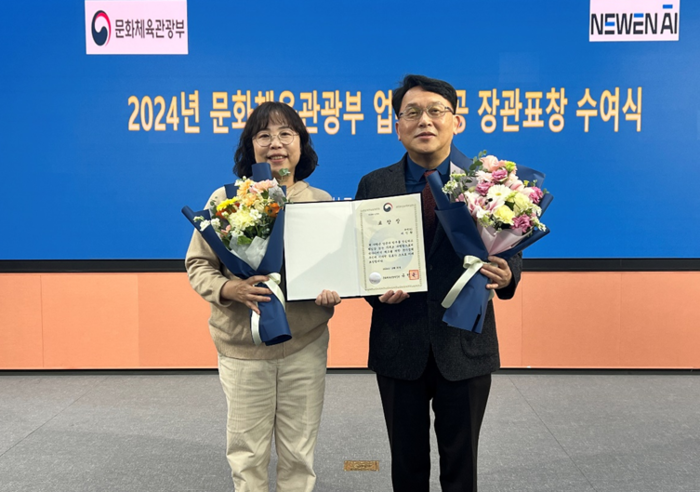 배성환 뉴엔AI 대표(오른쪽)과 최강 문화체육관광부 해외뉴스분석팀장이 문체부 장관 표창 수여식에서 기념촬영을 하고 있다. [사진 제공=뉴엔AI] 생성형 인공지능(AI) 기반 빅데이터 분석 전문 기업 뉴엔AI는 문화체육관광부 국제문화홍보정책실(구 해외문화홍보원)의 ‘해외 빅데이터 분석 프로젝트’를 성공적으로 수행한 공로를 인정받아 문체부 장관 표창을 수상했다고 12일 밝혔다.