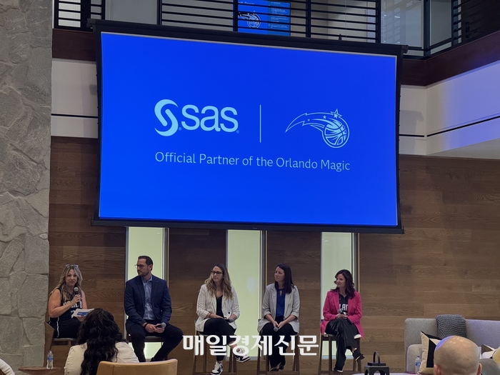 샤논 히스 SAS 기업 커뮤니케이션 디렉터(왼쪽부터),제이 리올라 올랜도 매직 최고 전략&혁신책임자,알리 앤더슨 올랜도 매직 비즈니스 전략 부문 시니어 디렉터,로렌 람비스 올랜도 매직 디지털 마케팅 디렉터,제니퍼 체이스 SAS 최고마케팅책임자가 6일(현지시간) 미국 플로리다주 올랜도의 올랜도 매직 트레이닝 센터에서 양사의 협력에 대해 소개하고 있다. [사진 = 정호준 기자] 양사가 처음 협력을 시작한 것은 2010년 올랜도 매직의 홈 구장인 올랜도 매직 기아 센터가 설립되면서부터다.