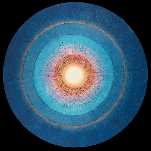 빛을 표현한 원형 작업이 특히 눈길을 끈다. 작가는 닥종이를 고깔 모양으로 구겨 주름을 만들고 이를 펼쳐 먹으로 원형을 그렸다. 이후 종이의 결을 따라 붓질했다. 튀어나온 부분에 색이 입혀지고 파인 부분에는 여백이 남는다. 여기에 아크릴,천연안료,유화 등을 여러 겹 쌓아 올렸다. 뒷면에 색을 입혀 앞면에 은은하게 스미게 하는 동양화의 배체법을 더해 독특한 마티에르를 완성했다. 빛이 반짝이듯 아름다운 색채가 깊이 있는 화면에서 피어오른다. 전시는 9월 27일까지.