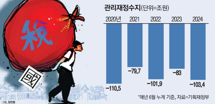 관리재정수지 적자 규모가 100조원을 넘긴 것은 역대 세 번째다. 가장 규모가 컸던 것은 2020년(110조5000억원)으로 코로나19 긴급재난지원금 집행에 따라 지출이 확대됐다. 2022년(-101조9000억원)에도 적자가 100조원을 넘었다. 올해 상반기 적자 규모는 연간 예상 적자 규모인 91조원보다도 크다.