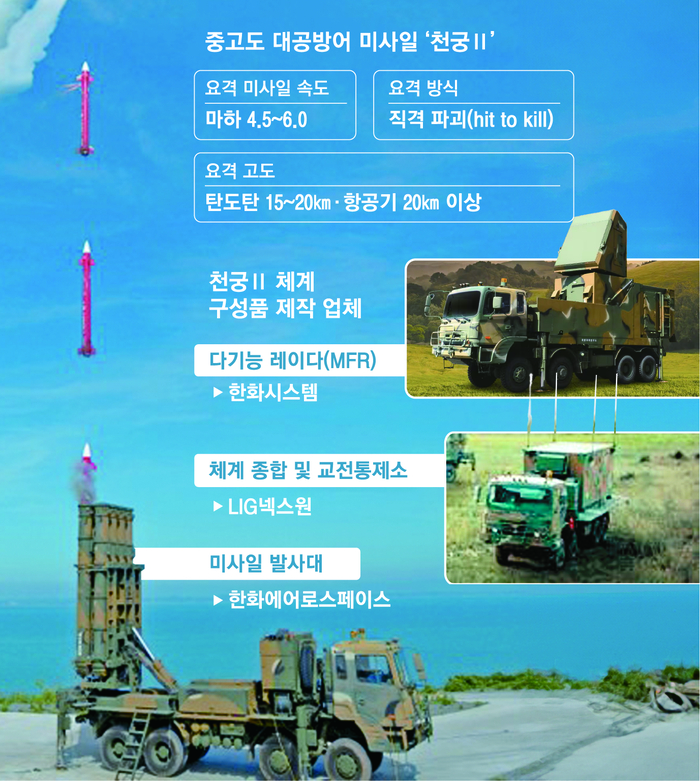 중고도대공방어미사일 천궁 2 지난해 9월 이라크와 체결됐던 28억달러(약 4조원) 규모 이라크 방공미사일 ‘천궁Ⅱ’ 수출 계약을 둘러싸고 LIG넥스원과 한화그룹 방산 계열사 간에 이어지던 갈등이 해결돼 곧 국내 계약도 체결된다. 정부 관계자는 18일 “양사가 지난 10개월간 지속적인 협의를 해왔고 의견 차이를 좁혀 합의에 도달했다”며 “이라크에 수출할 천궁Ⅱ의 각 구성품에 대한 납기와 납품 가격을 명시한 계약이 곧 체결될 예정”이라고 말했다.
